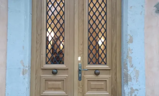 Magnifique réalisation d’une porte d’entrée en chêne reproduite à l’identique.