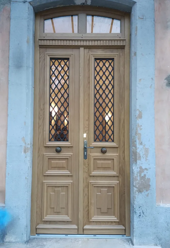 Magnifique réalisation d’une porte d’entrée en chêne reproduite à l’identique.